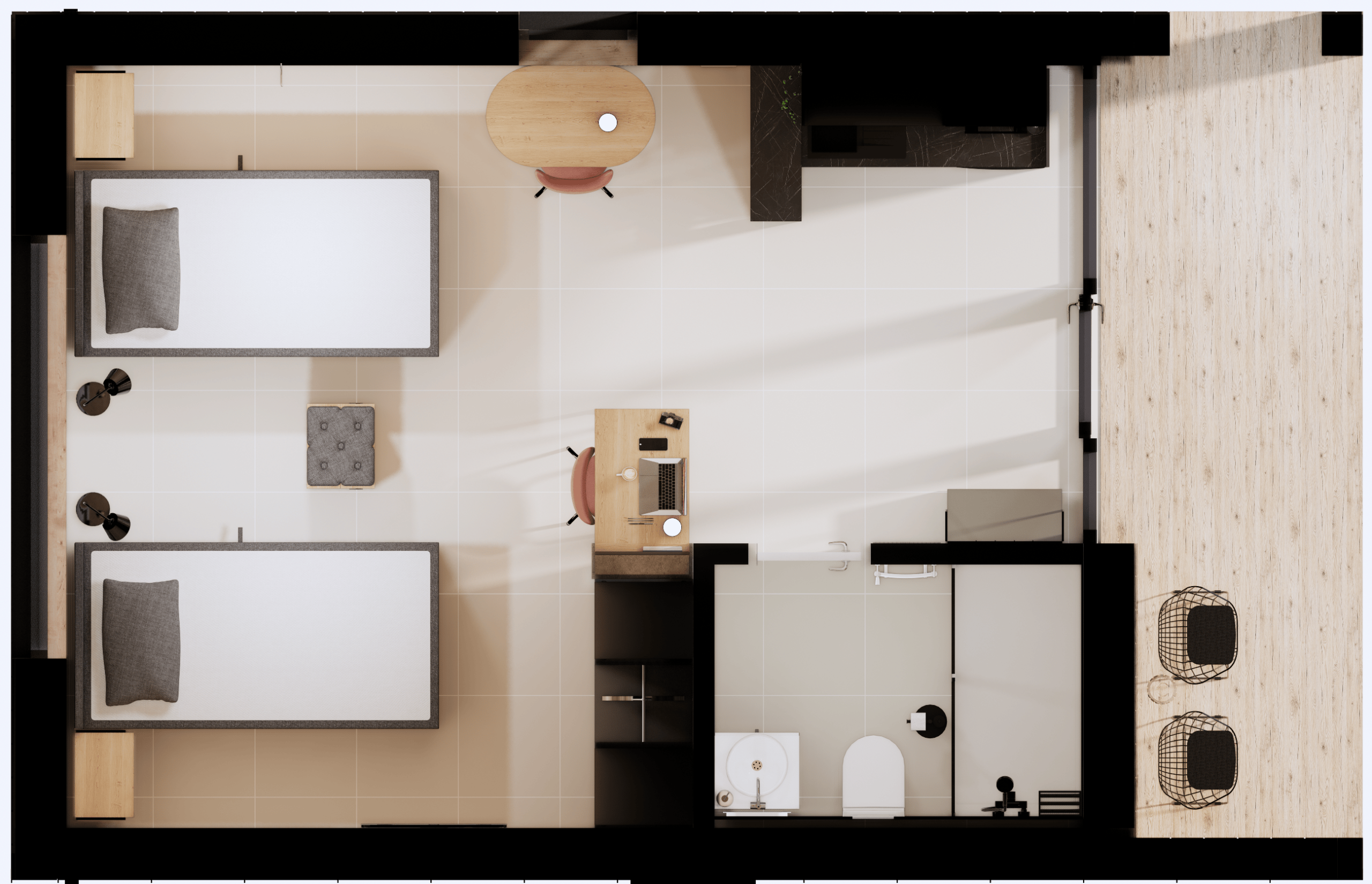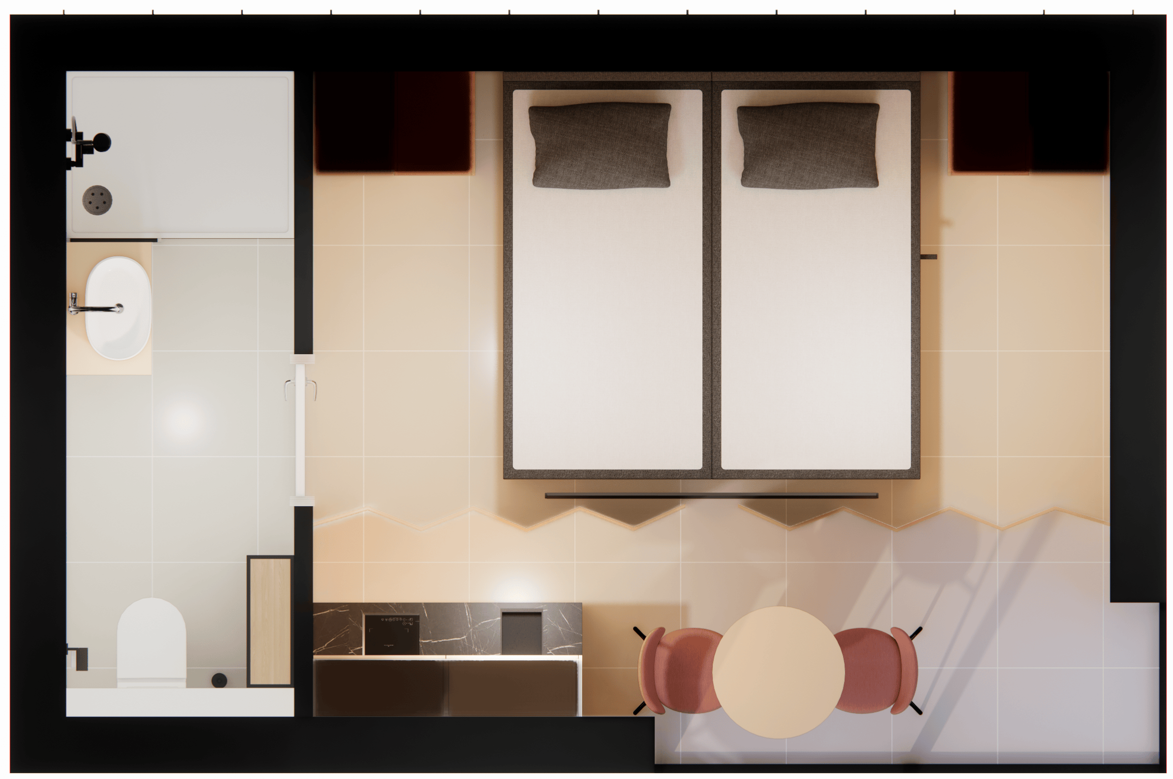 - Spavaći dio opremljen je razdvojivim bračnim krevetom koji se može prilagoditi potrebama korisnika, bilo kao jedan ili dva odvojena ležaja.