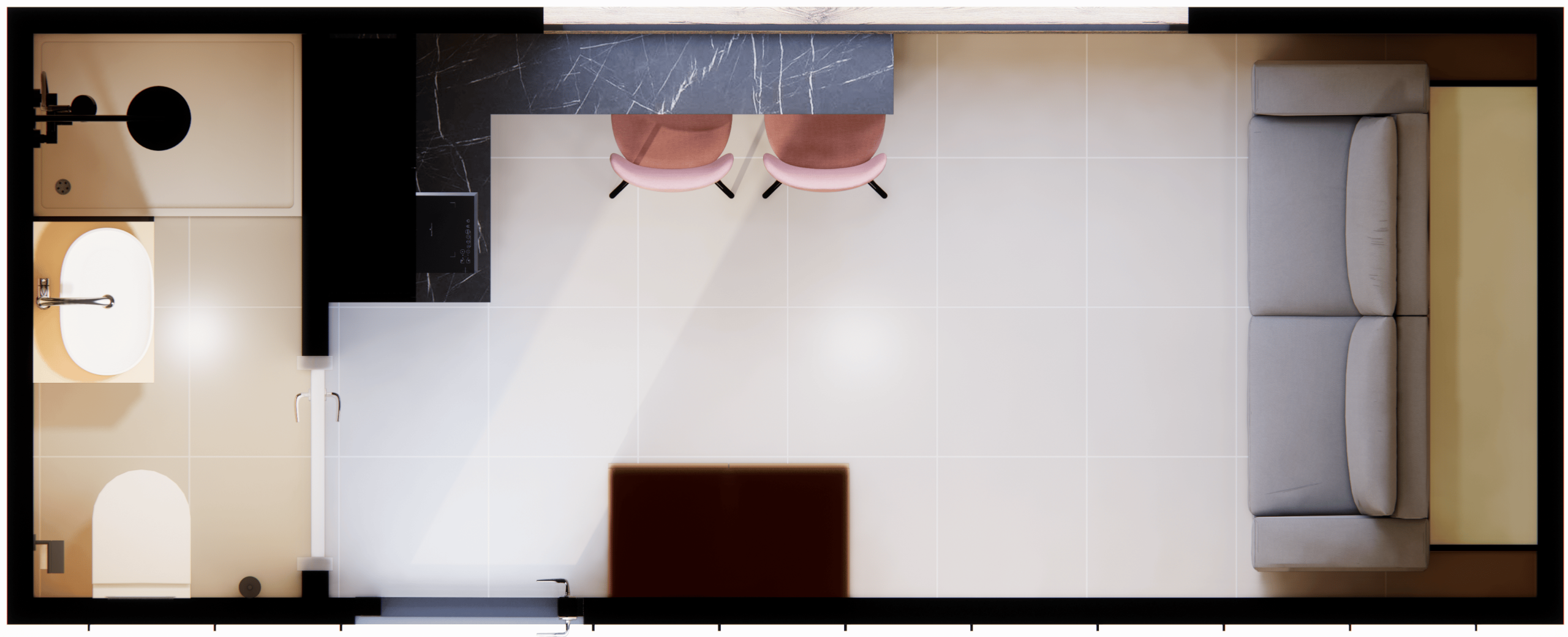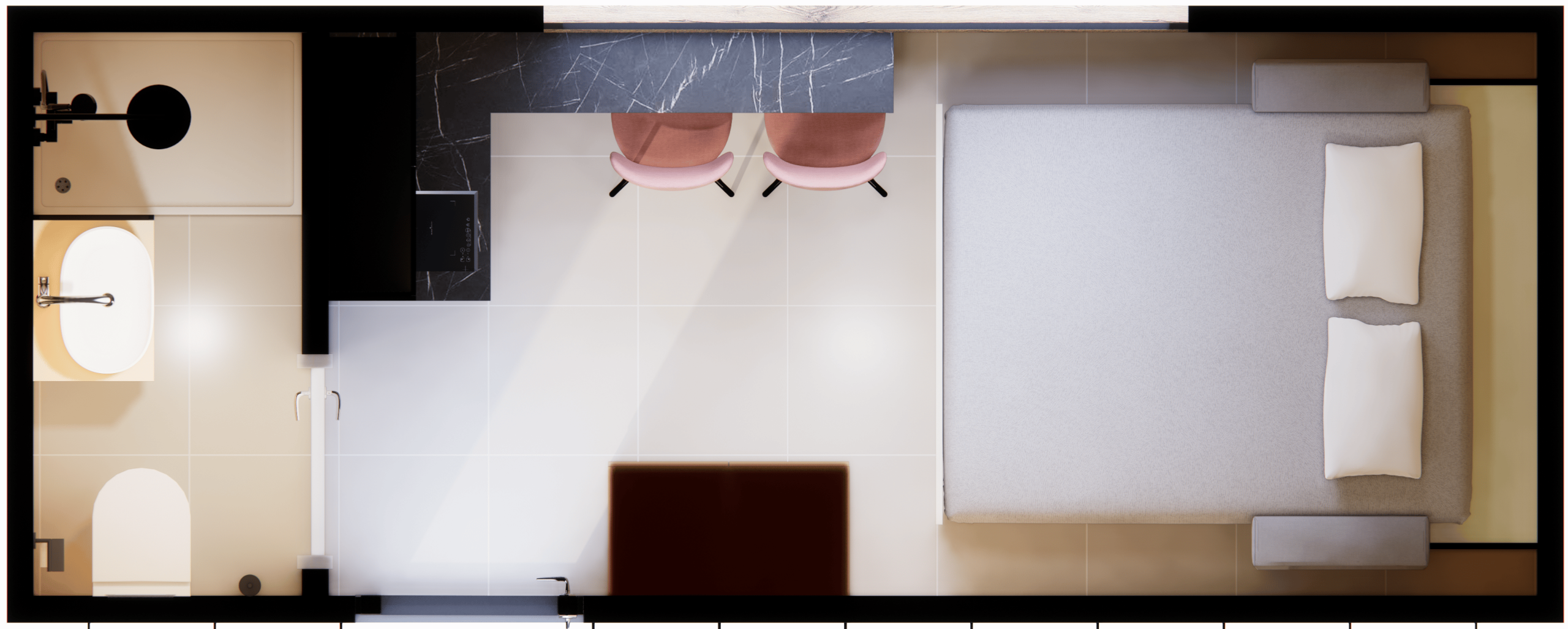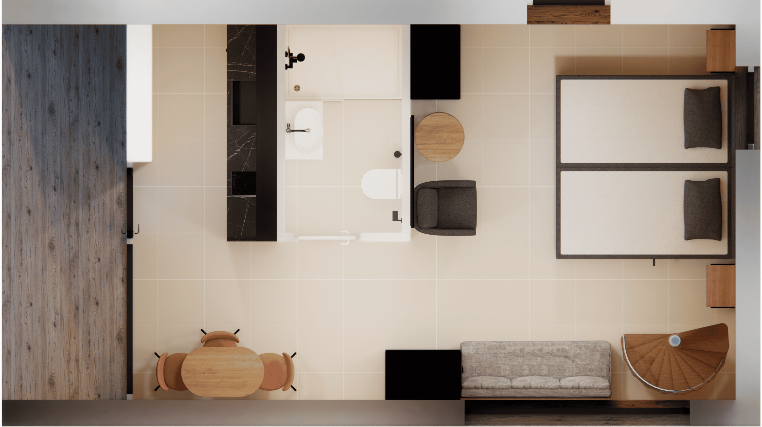 - Glavni prostor uključuje inovativno rješenje s preklopnim krevetom koji se jednostavno podiže u zid, pri čemu se transformira u udoban kauč. Time se dnevni boravak brzo prilagođava različitim potrebama korisnika.